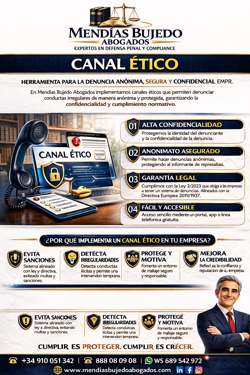 El Canal de Denuncias de Mendías Bujedo Abogados es una solución jurídica y tecnológica diseñada para que empleados, proveedores y terceros puedan comunicar de forma segura y confidencial cualquier irregularidad dentro de una organización. Este servicio cumple con los requisitos establecidos por la Ley 2/2023 y la Directiva Europea de Protección del Informante, garantizando la protección del denunciante y la trazabilidad de las comunicaciones.
